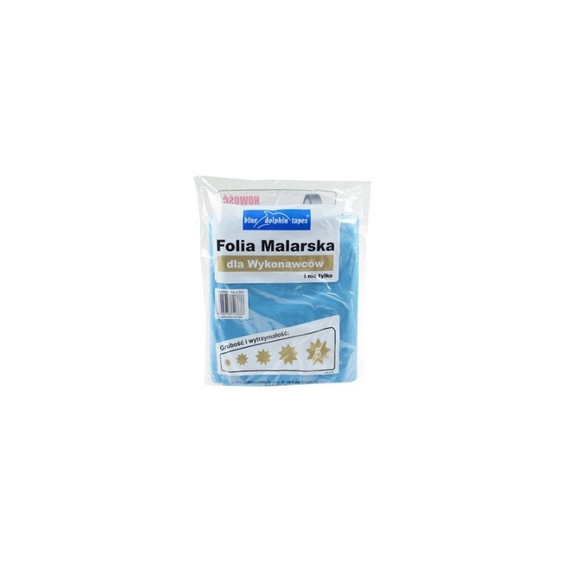Folia malarska dla wykonawców Blue Dolphin służy do ochrony mebli oraz różnego rodzaju sprzętu domowego przed zabrudzeniami podczas prac malarskich i remontowych. Charakteryzuje się podwyższonymi parametrami wytrzymałościowymi. Folia malarska dla wykonawców Blue Dolphin doskonale chroni przed kurzem i zachlapaniami. Jest 40% bardziej wytrzymała niż inne folie produkowane z regranulatu. Charakteryzuje się niebieskim zabarwieniem oraz odpornością na działanie promieniowania UV.