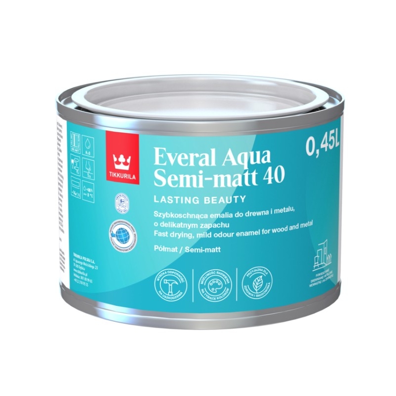 Tikkurila Everal Aqua Semi Matt 40 to najnowszej generacji, tworząca powłokę półmatową emalia wodorozcieńczalna, która nadaje pomalowanej powierzchni wysoką odporność na zmienne warunki atmosferyczne, działanie promieni UV, uszkodzenia mechaniczne oraz na podwyższoną temperaturę (emalia polecana jest m.in. do kaloryferów).