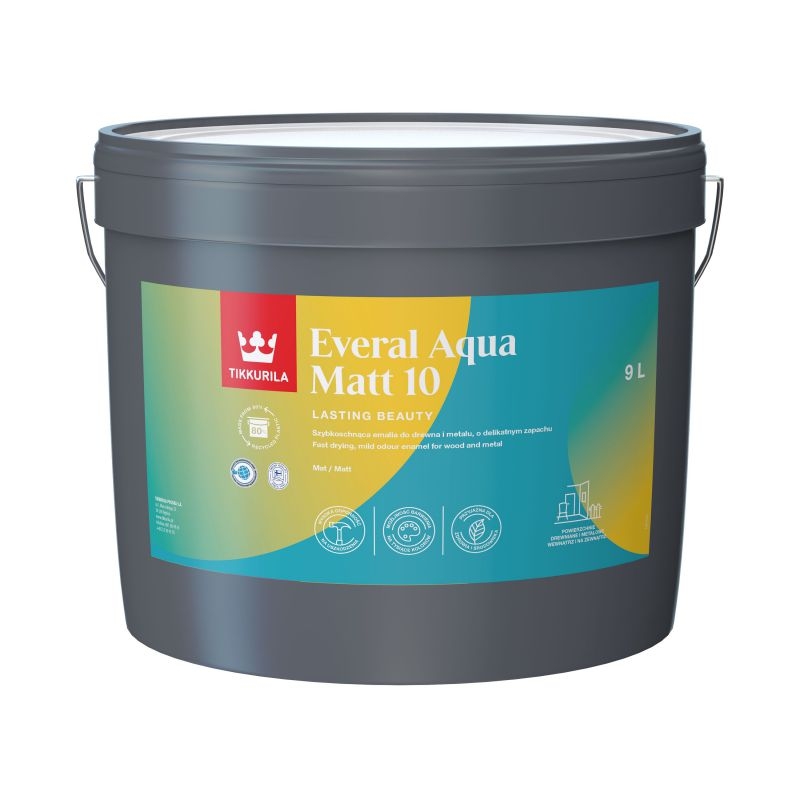 Tikkurila Everal Aqua Matt 10 to najnowszej generacji, matowa, emalia wodorozcieńczalna, która nadaje pomalowanej powierzchni wysoką odporność na zmienne warunki atmosferyczne, działanie promieni UV, uszkodzenia mechaniczne oraz na podwyższoną temperaturę (emalia polecana jest m.in. do kaloryferów).