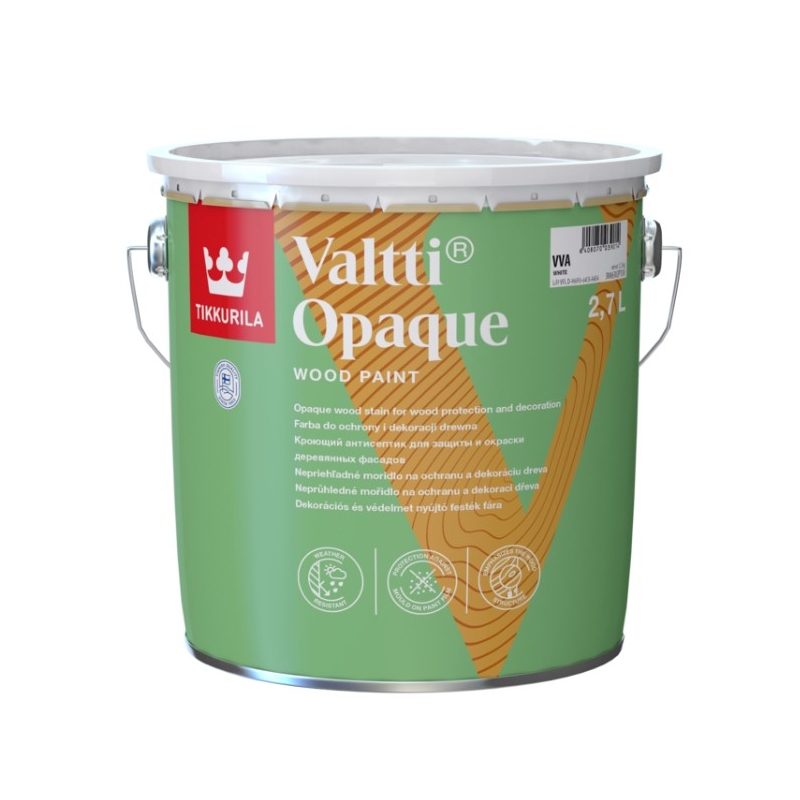 Półmatowa farba akrylowa wzmacniana związkami alkidowymi, charakteryzująca się niską emisją zapachu, przeznaczona do stosowania na zewnętrznych powierzchniach drewnianych. Odporna na działanie warunków atmosferycznych, elastyczna, wyjątkowo trwała i niewymagająca wielu zabiegów konserwacyjnych. Tikkurila Valtti Opaque jest farbą regulującą poziom wilgotności, dzięki czemu nie powstają na niej pęcherze, nie pęka i nie łuszczy się. Zabezpiecza drewno przed działaniem promieni UV.