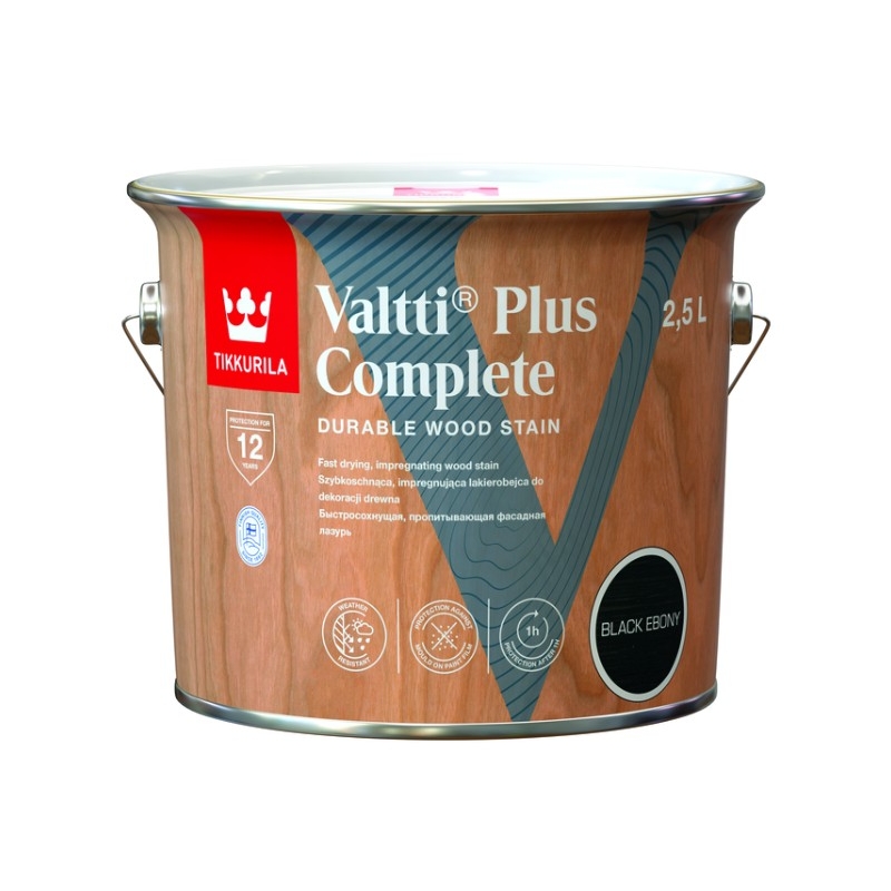 Tikkurila Valtti Plus Complete może być barwiona na kilkadziesiąt kolorów z mieszalnika. Double Barrier UV System - synergia dwóch filtrów UV - gwaratnuje najwyższą ochronę przed destrukcyjnym promieniowaniem UV zapewniając w ten sposób trwały i jednolity kolor powłoki.