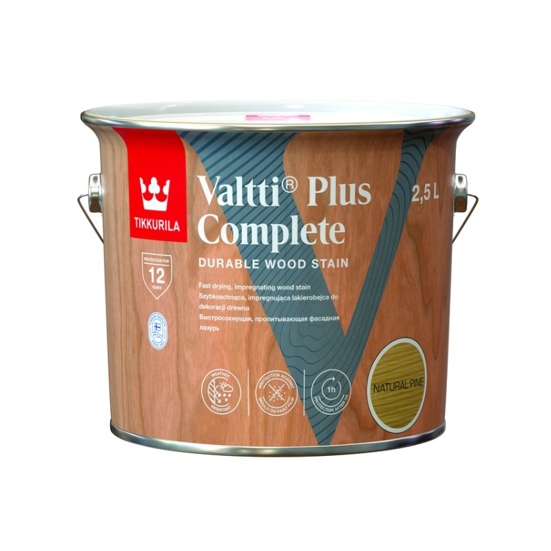 Tikkurila Valtti Plus Complete może być barwiona na kilkadziesiąt kolorów z mieszalnika. Double Barrier UV System - synergia dwóch filtrów UV - gwaratnuje najwyższą ochronę przed destrukcyjnym promieniowaniem UV zapewniając w ten sposób trwały i jednolity kolor powłoki.