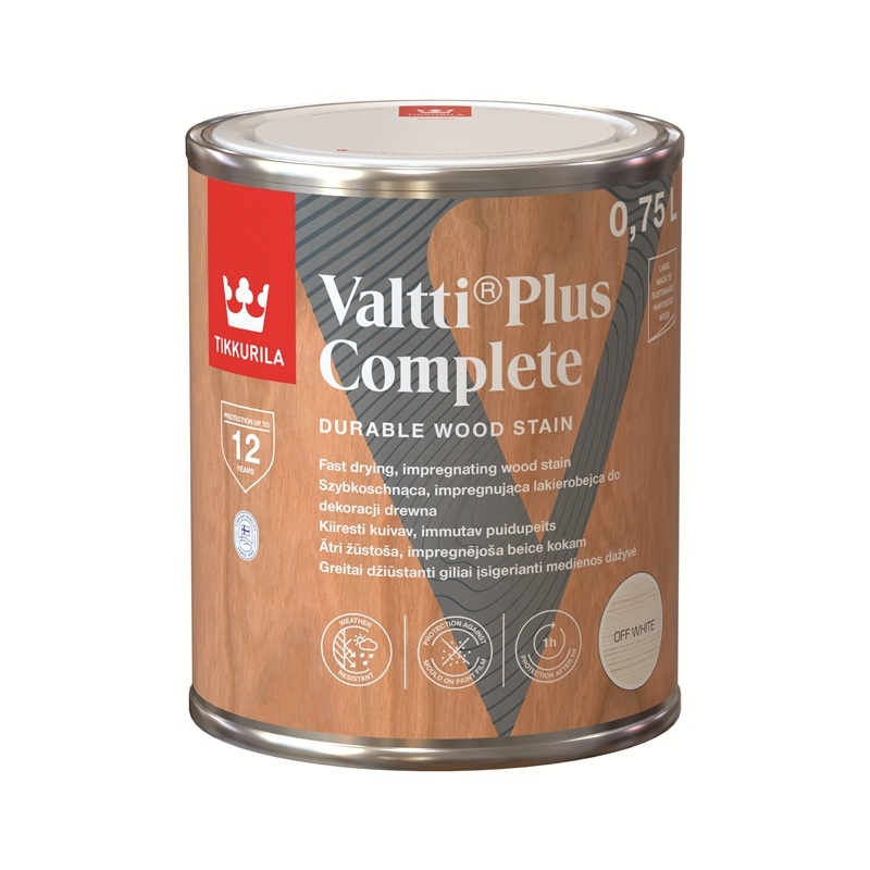 Tikkurila Valtti Plus Complete może być barwiona na kilkadziesiąt kolorów z mieszalnika.  Double Barrier UV System - synergia dwóch filtrów UV - gwaratnuje najwyższą ochronę  przed destrukcyjnym promieniowaniem UV zapewniając w ten sposób trwały i jednolity kolor powłoki.