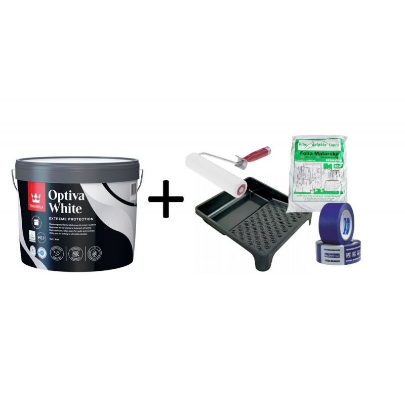 Komplet malarski: farba Tikkurila OPTIVA White 9L + folia + wałek + kuweta + taśma malarska