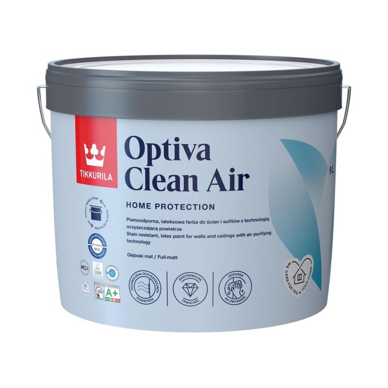 •Tikkurila OptivaCleanAirzawiera innowacyjną technologię spoiwa o właściwościach redukujących formaldehyd.