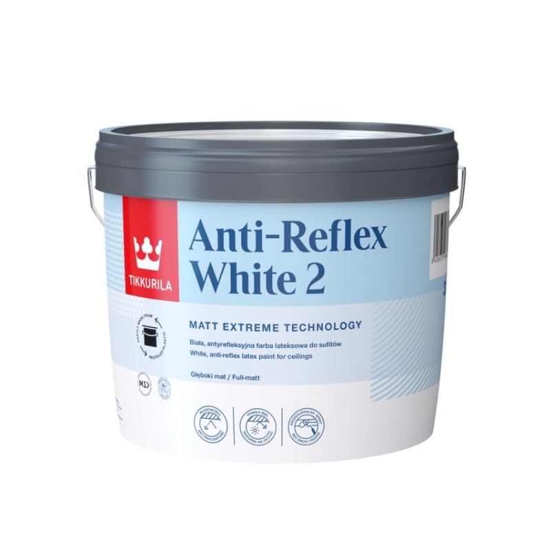 Biała, antyrefleksyjna, wodorozcieńczalna, wysokiej jakości głęboko matowa farba lateksowa do malowania sufitów wewnątrz pomieszczeń. Dzięki unikatowej kompozycji związków tytanu oraz wypełniaczy funkcyjnych farba niweluje refleksy świetlne wywołujące wrażenie nierówności podłoża.