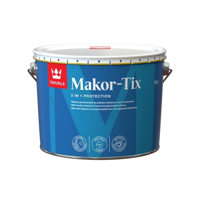 Gruntoemalia przeznaczona jest do bezpośredniego, dekoracyjno-ochronnego malowania powierzchni stalowych, stalowych ocynkowanych (zaleca się malowanie wysezonowanych powierzchni ocynkowanych), cynkowych, żeliwnych, aluminiowych, miedzianych oraz stopów metali z niewielkimi ogniskami korozji. Szczególnie polecana jest do malowania pokryć dachowych, rynien, siatek ogrodzeniowych, konstrukcji oraz podłoży metalizowanych, eksploatowanych w środowiskach o kategorii korozyjności atmosfery: C1, C2, C3 (wg PN-EN ISO 12944-2). TIKKURILA MAKOR-TIX może służyć do renowacji powłok malarskich o dobrej przyczepności do podłoża, pod warunkiem uzyskania pozytywnego wyniku po wykonaniu wymalowania próbnego. Produkt może być stosowany wewnątrz pomieszczeń nieprzeznaczonych na stały pobyt ludzi.