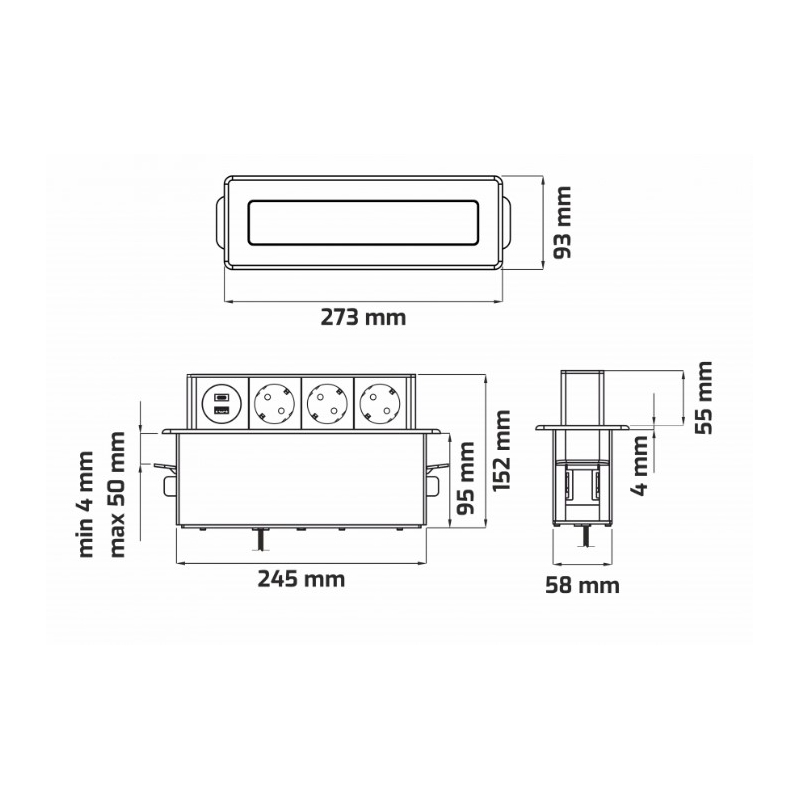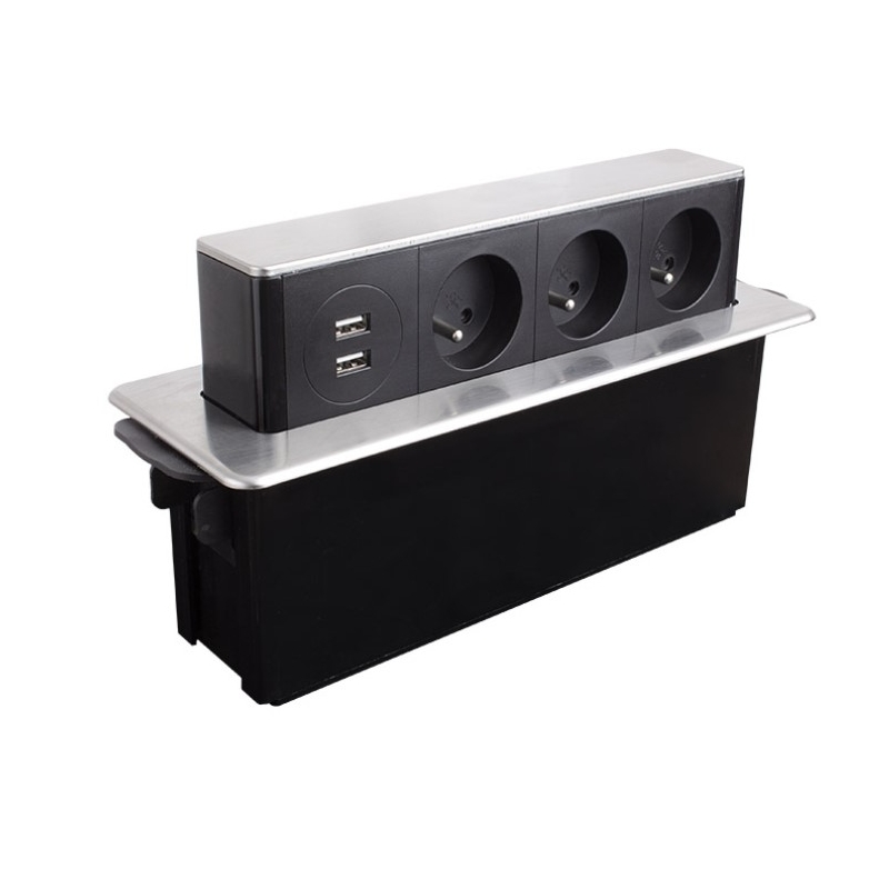 HOP BOX to nowoczesne gniazdo meblowe wpuszczane w blat kuchenny lub biurowy z wysuwanym panelem.