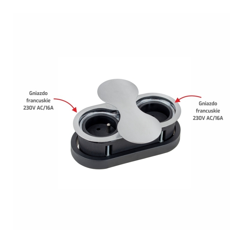 EIGHTBOX to nowoczesne gniazdo meblowe z rotacyjnie otwieraną przesłoną, która uruchamia się po naciśnięciu jej środkowej części (przetestowana na 40 tys. cykli). Metalowa osłona obraca się po okręgu o średnicy fi 130 mm. Pod przesłoną kryją się dwa gniazda francuskie 230V AC/16A, do których można podłączyć urządzenia o maksymalnej mocy 3 680W.