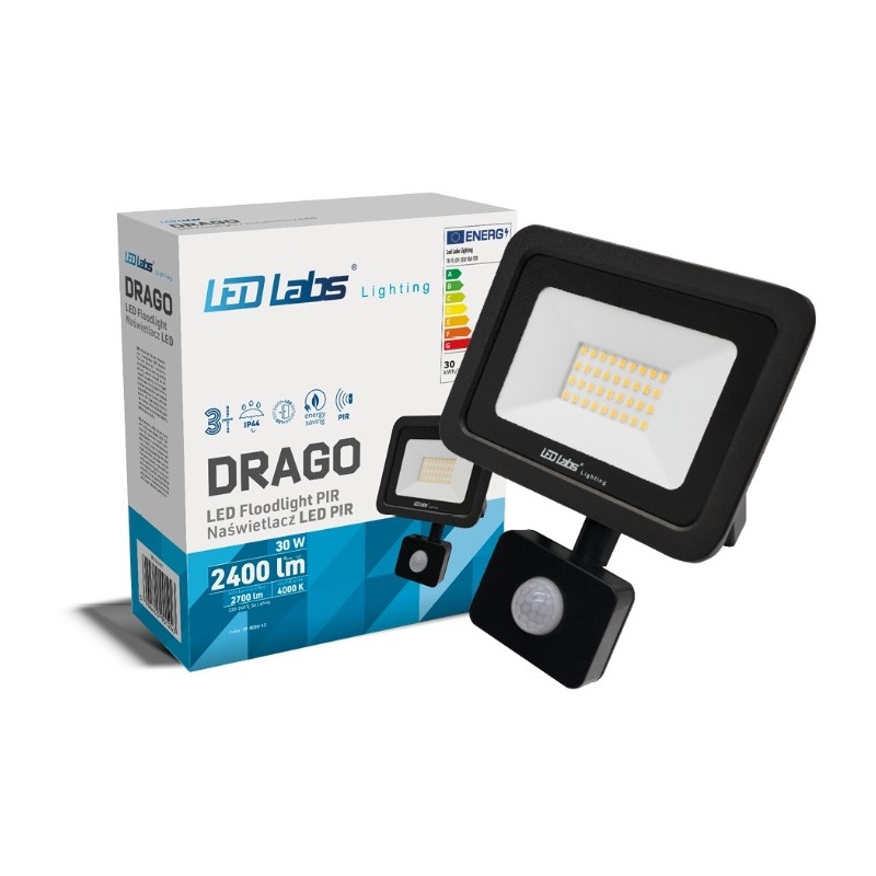 Naświetlacz LED DRAGO 30W PIR charakteryzuje wysoki strumień świetlny, który zapewnia idealne doświetlenie niemal każdej przestrzeni. Uniwersalna biała neutralna barwa światła zbliżona jest do światła dziennego. Obudowa naświetlacza jest wykonana z odlewu aluminium, który zapewnia dobre odprowadzanie ciepła. Oznacza to dłuższą żywotność diod LED. Klosz z hartowanego szkła zwiększa odporność na przypadkowe uszkodzenia. Ryflowana obudowa klosza zapewnia dobre rozproszenia światła i eliminację zjawiska olśnienia. Czujnik ruchu PIR umożliwia automatyczne włączanie i wyłączanie oświetlania. Możliwe ustawienie zakresu włączenia w czasie od 7 sekund do 8 minut po wykryciu ruchu. Sensor ma funkcję czujnika zmierzchu, działającą poprzez regulację natężenia światła. Czujnik może automatycznie włączać się zarówno w czasie dnia, jak i nocy, zależnie od ustawionych parametrów. Obszar wykrywania ruchu od 2m do 10m. Naświetlacz posiada wbudowany układ zasilania, dlatego jest zasilany napięciem sieciowym.