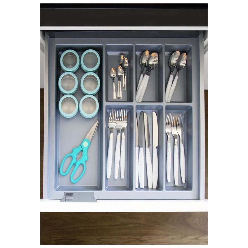 Przy podanej szerokości do dyspozycji mamy 7 komór. Trzy mniejsze komory posłużą do przechowywania łyżeczek, widelczyków czy innych drobnych akcesoriów np.: zaparzacza do herbaty, trzy większe komory świetnie zorganizują przestrzeń na łyżki stołowe, noże i widelce.