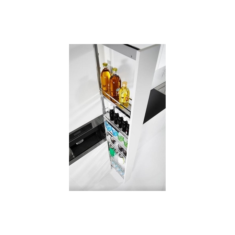 Cargo Dispensa Arena Style jest przeznaczone do montażu w wysokim słupku meblowym o szerokości 150 mm (front po zewnętrznej). Ramę systemu mocujemy od wewnętrznej strony do frontu, natomiast prowadnicę dolną i górne prowadzenie do korpusu szafki. Po wysunięciu systemu z szafki mamy doskonały dostęp do przestrzeni magazynowej z dwóch stron szafki. Cargo Dispensa 150 fantastycznie zagospodaruje wąskie wnęki i dodatkowo pomieści spore ilości zapasów.