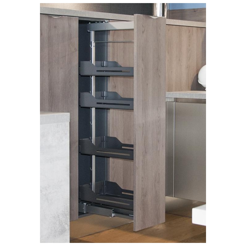 Wyciąg Dispensa dedykowany jest do szafki typu cargo, w którym ramę systemu mocujemy od wewnętrznej strony do frontu, natomiast prowadnicę dolną i górne prowadzenie do korpusu szafki. Po wysunięciu systemu z szafki mamy doskonały dostęp do przestrzeni magazynowej zarówno z jednej jaki i z drugiej strony. Jeśli zaplanujesz rozkład szafek, tak aby cargo Dispensa, umieścić tuż obok lodówki, wówczas zgromadzone produkty suche będą w jednej strefie – nie będziesz już zbierać składników z różnych schowków, szafek i szuflad, wystarczy, że jednym ruchem wysuniesz całą zawartość szafki a wszystko będziesz mieć w zasięgu ręki. Dzięki temu funkcjonalnemu cargu Dispensa zyskujesz praktyczną przestrzeń na przechowywanie zapasów, a każda umieszczona rzecz jest doskonale widoczna i można po nią łatwo sięgnąć.