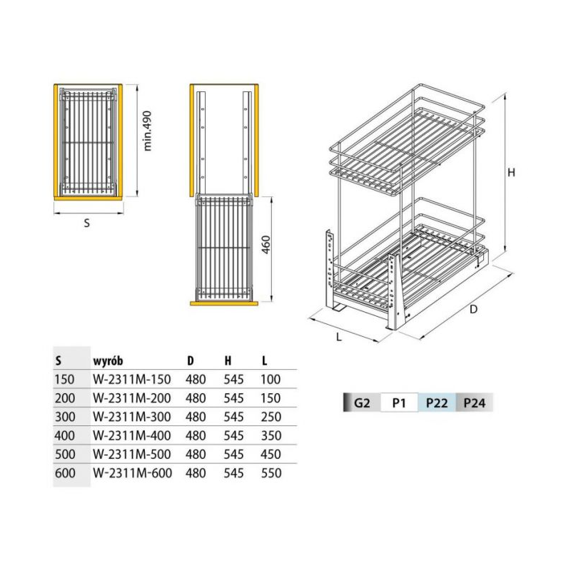 Kosz cargo mini 500 dwupoziomowy STANDARD, mocowanie dolne, P22 srebrny, NOMET W-2311M-500.P22