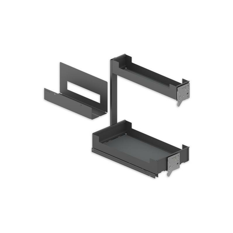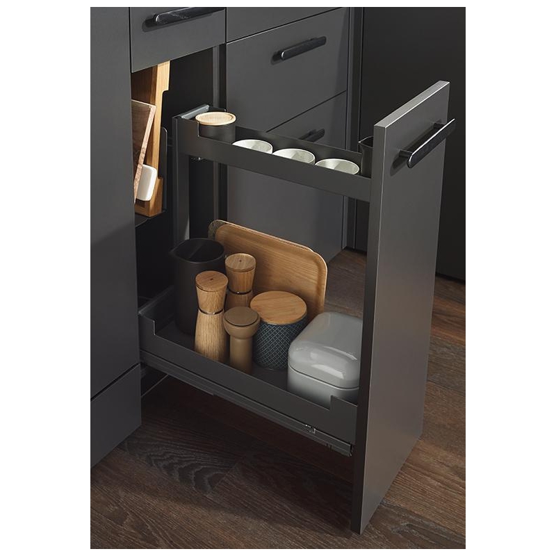 Wykończenie koszy Liro charakteryzuje się prostymi liniami i nieskomplikowanym kształtem. Półki są wykonane z najwyższej jakości powlekanej blachy stalowej, złożonej z milimetrową precyzją dlatego każdy kąt jest dokładnie taki sam. Pomimo, że półki są na stałe zintegrowane ze stelażem to dzięki gładkiej powierzchni są łatwe w czyszczeniu. Dodatkowo dno półek doposażone i chronione jest matami silikonowymi, które można bez problemowo wyjąć do wyczyszczenia. System dostępny jest w kolorze antracytowym.