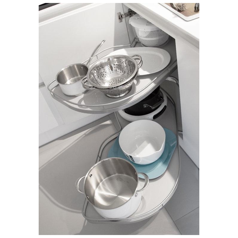 Le Mans II system do szafki narożnej prostej z frontem na zawiasach. System do szerokości szafki 1000 mm* i szerokości frontu 600 mm. Komplet dostępny jest z koszami w linii ARENA Classic Silver. Relingi wykonane są z malowanych proszkowo srebrnych okrągłych elementów. Drewniane dno koszy w kolorze szarym, pokryte jest antypoślizgową przezroczystą powłoką. Montaż na listwie profilowej przykręcanej do boku szafki, pozwala zmienić wysokość półek podczas użytkowania. Dobranie odpowiedniego rozstawienia między nimi pomaga nam lepiej wykorzystać szafkę. Dopuszczalne obciążenie w systemie Le Mans II zostało zwiększone o kolejne 5 kg. Na każdej z półek możemy teraz umieścić ciężar 25 kg.