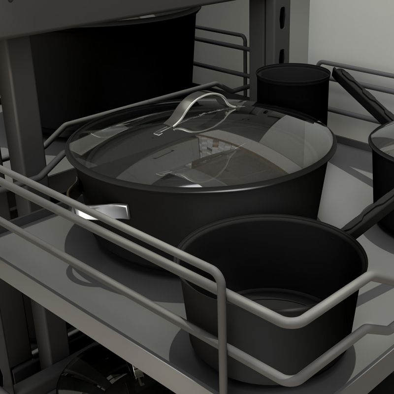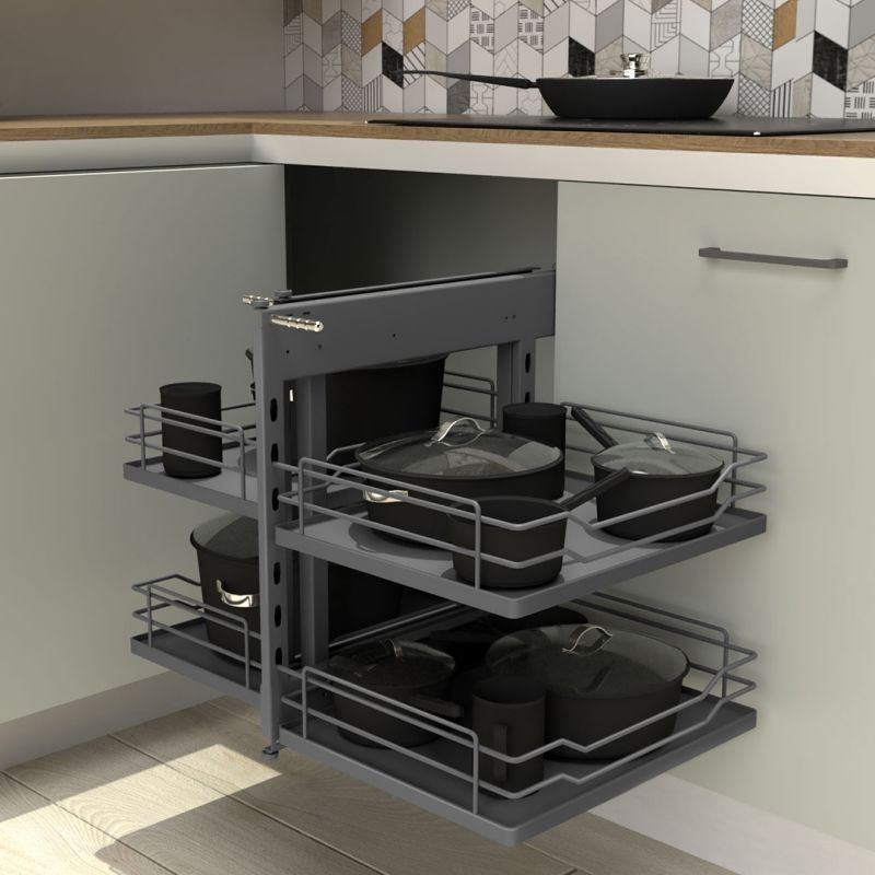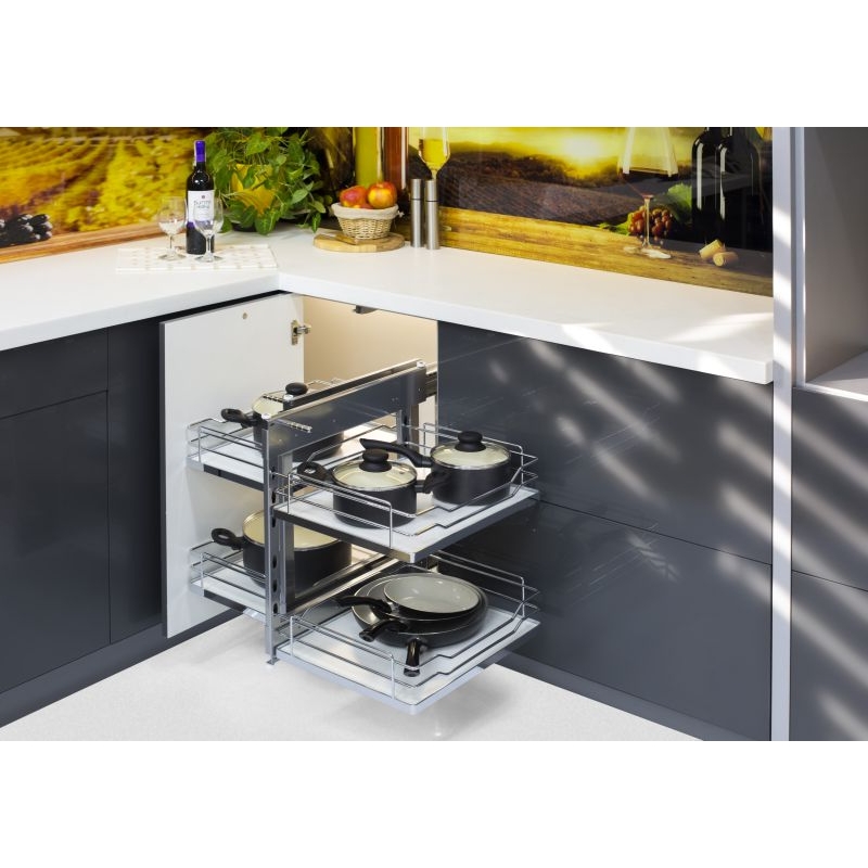 Idealnie zaprojektowana kuchnia wykorzysta każdą przestrzeń… System dający gwarancję optymalnego zagospodarowania przestrzeni w narożnikach zabudowy kuchennej, który umożliwia łatwy i szybki dostęp do przechowywanych w niej sprzętów i produktów spożywczych. Magic komfort  wyposażony jest w 4 półki z możliwością regulacji ich wysokości w zależności od potrzeb. System ten zapewnia wysunięcie całej zawartości narożnika na zewnątrz.